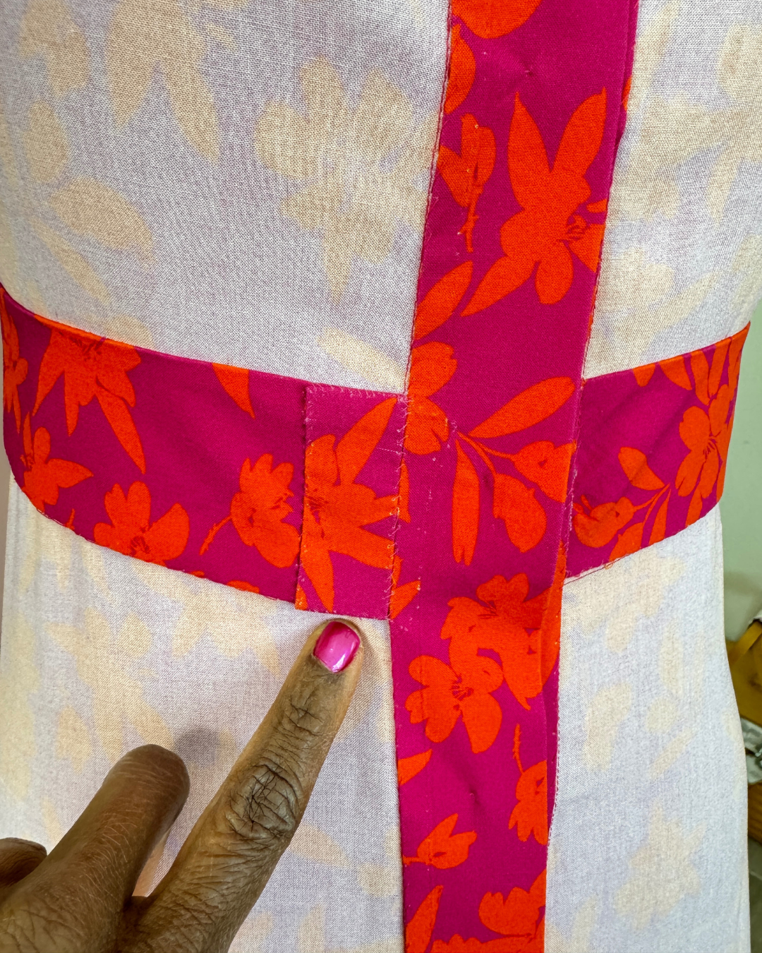 I had a little mishap with my midriff facing on the inside of the dress. The midriff came up a little short on one side. Instead of taking it apart and cutting a new piece, I did a little bootleg patch job. Hahaha! I cut a strip of fabric, pressed it to the size I needed, and hand sewed it to cover the shortage. Shhhh… Nobody has to know but us.