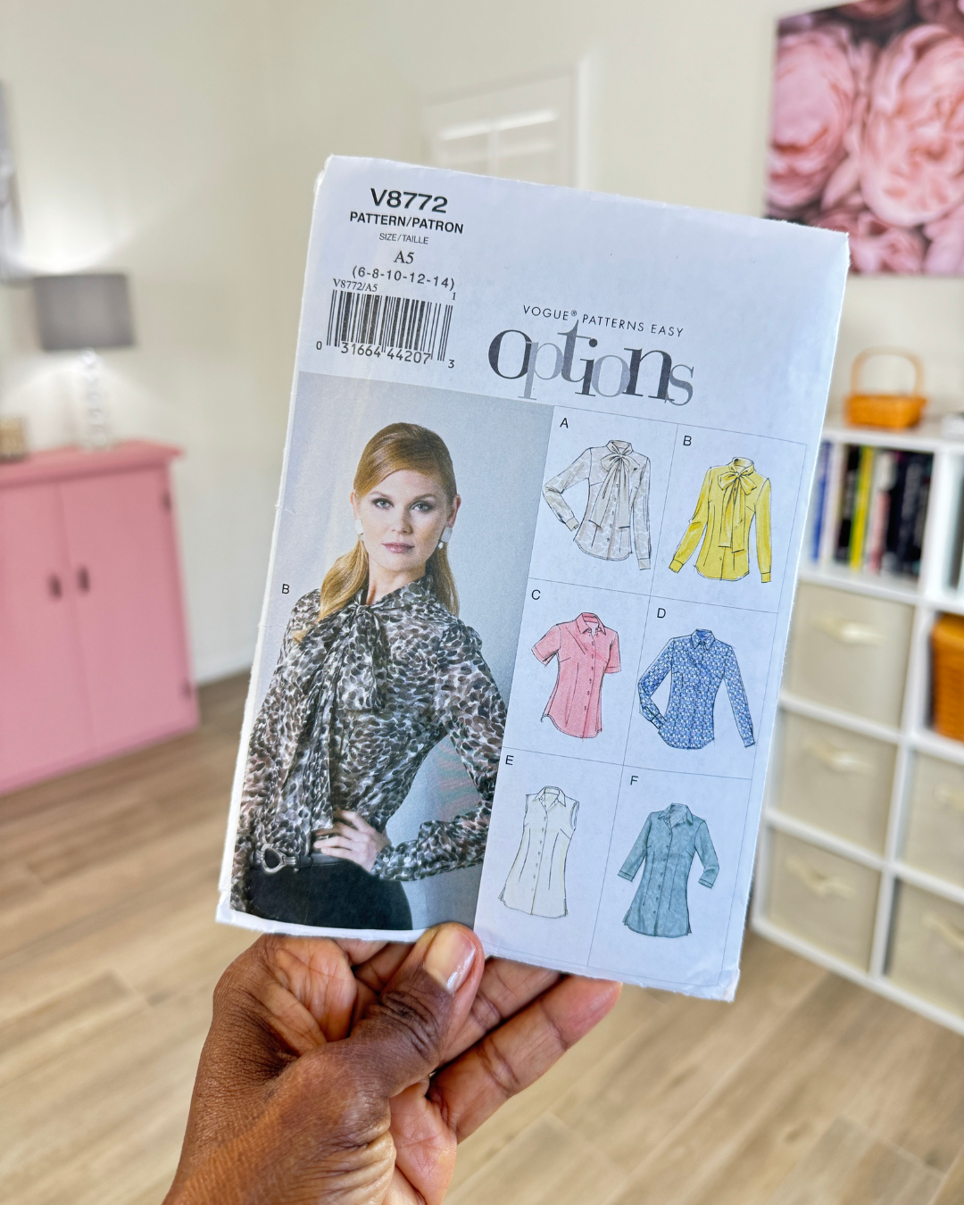 I used VOGUE 8772 to make the button front blouse. The garment is fitted with collar, sleeve and hem variations (narrow), Fisheye darts and French darts. It is currently available on the Simplicity website in paper copy only in sizes 6 – 22. The company rates the pattern as EASY but I will say it depends on your skill level. If you’re a new beginner, I’m not sure this will be an easy project. Even if you’re an advanced beginner, I would only recommend this pattern if you’ve had some experience working with collars, sleeve cuffs, continuous lap on sleeves, and curved hemlines.