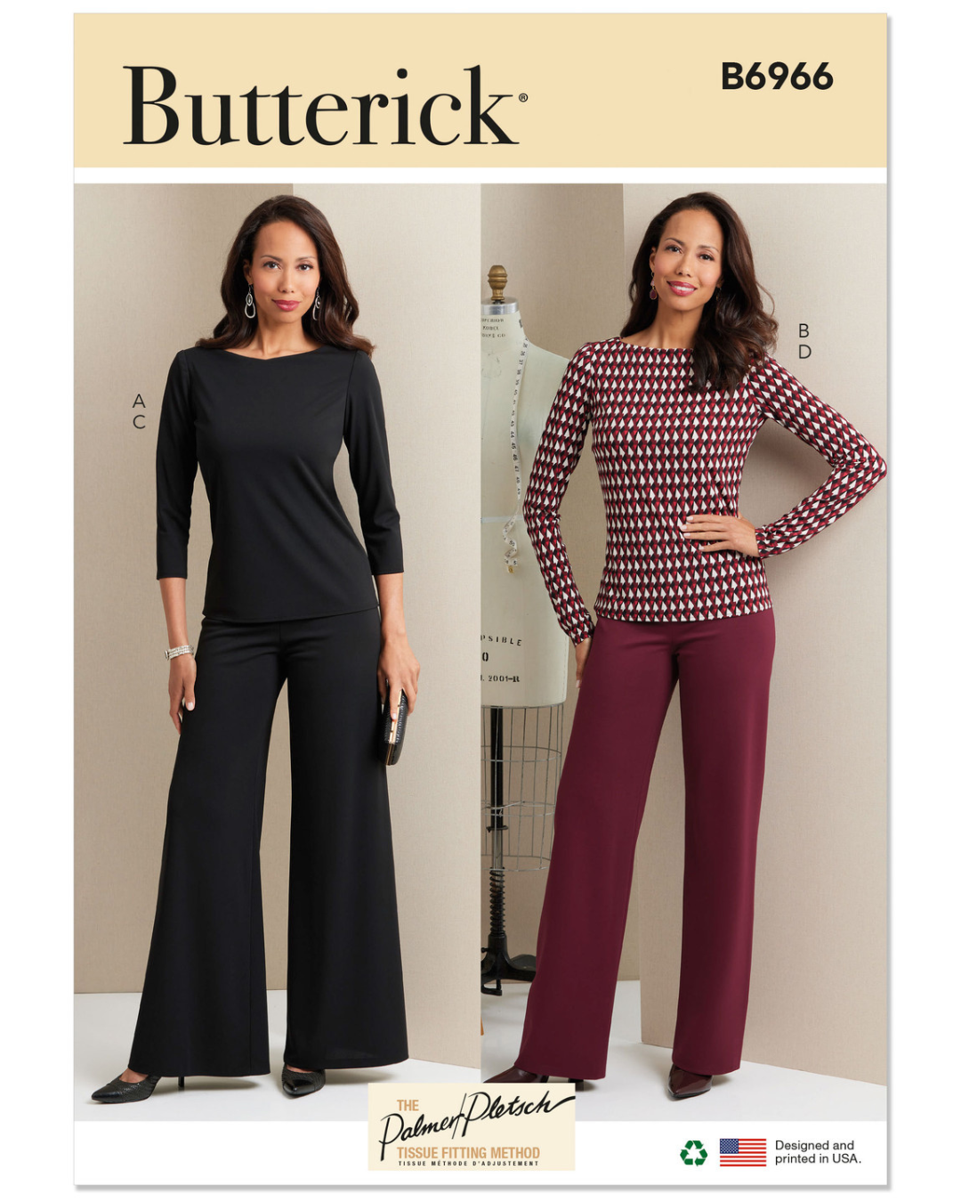 Butterick 6966 is a Palmer/Pletsch design and includes a close-fitting pullover top with neckline and sleeve variations; fitted, straight-legged or slightly flared pants with elastic waist. There are no side seams on the pants.ย