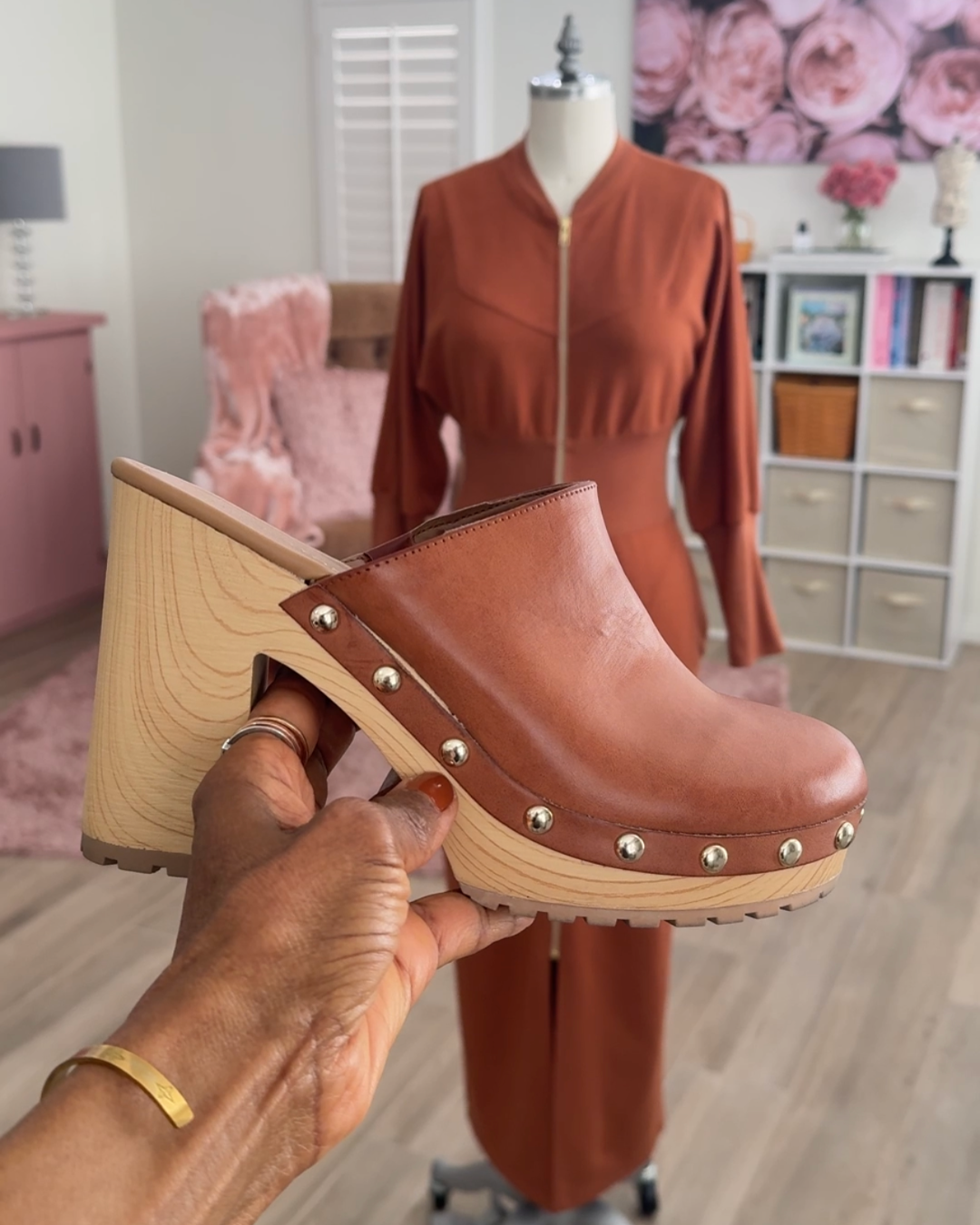 I styled the dress with my gold studded, copper colored clogs. They were a perfect color match for the dress, and the studs matched the gold zipper pull and teeth. I wore a crossbody bag that gave it a more casual vibe. My jewelry was simple — a pair of 3-tiered gold earrings, a ring trio and thin, gold bracelet.