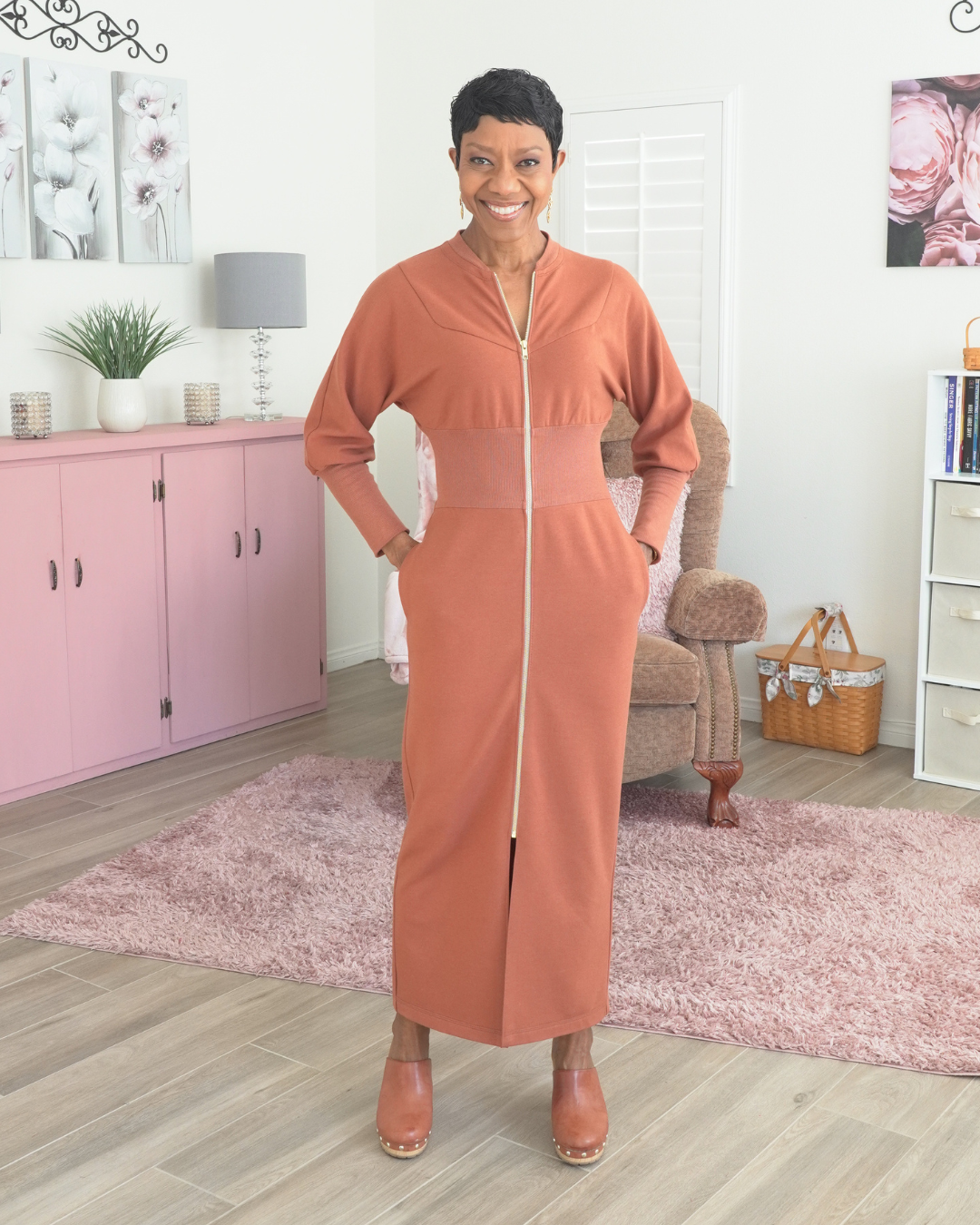 First I have to say that the fit is wonderful and you certainly look just fabulous. The match on the rib to the main fabric is spot on. Who would ever have thought fleece would look so good as a real dress. I love how you left the inside finish off on the pockets so they wouldn’t show through so much. I love all the looks and the I think the clogs are perfect with it.