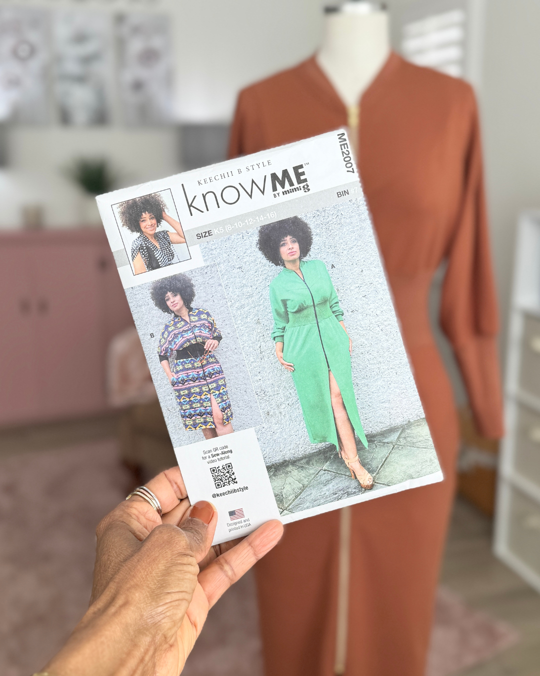 KNOW ME 2007 is from the KNOW ME BY MIMI G pattern line. It was designed by Marcia with Keechi B Style. It’s a knit dress with an exposed separating zipper; inseam side pockets; front yoke; contrasting rib knit collar, sleeve bands and midriff. View A is a maxi length with short sleeve bands, and View B is just below the knee with long sleeve bands.