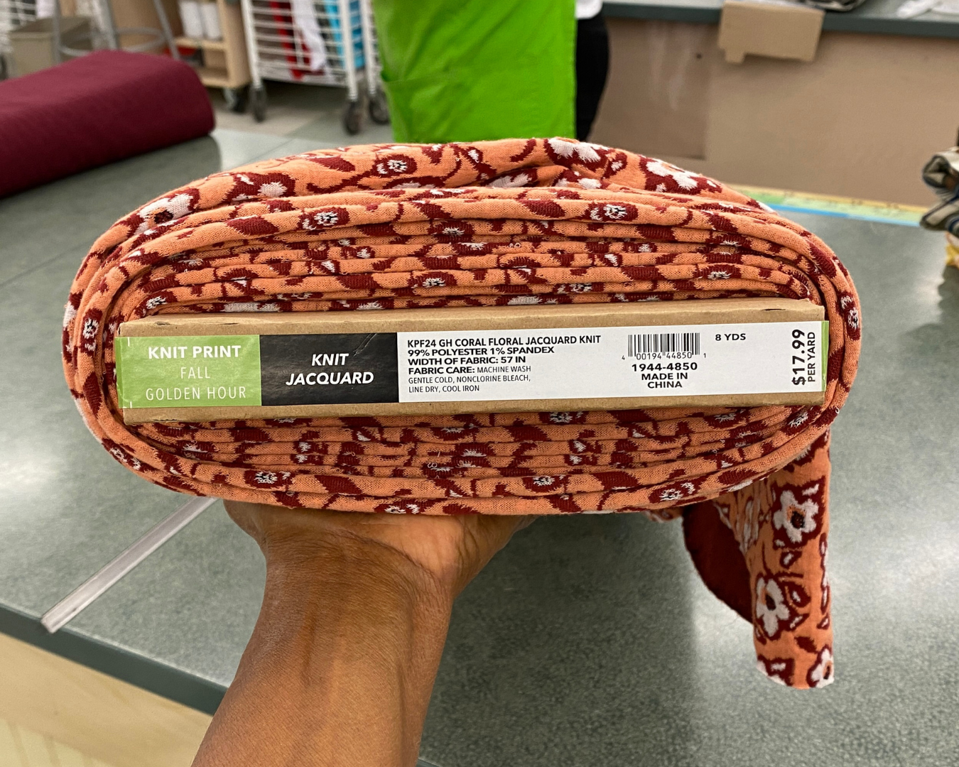 Knits! Knits! Knits! Give me all the KNITS! The pattern envelope suggests: Brocade, Wool Blends, Velveteen, and Baby Cord for the jacket. I used this beautiful Coral Floral Jacquard Knit instead. The lining is a lightweight knit from my fabric stash.